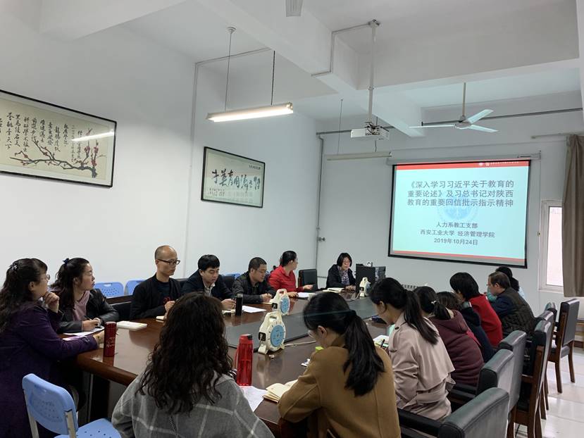 本次会议由人力系承办,在会上,人力系教工支部书记陈曦带领大家一起集中学习《习近平新时代中国特色社会主义思想学习纲要》、《深入学习习近平关于教育的重要论述》的学习要点,结合习近平总书记2015年走访陕西延安杨家岭福州希望小学、2017年对西迁老教授来信作出重要指示以及2018年给陕西照金北梁红军小学学生回信等重要事件,学习习近平总书记对陕西教育的重要回信批示指示精神;结合高校教学科研工作,还学习了西北大学中亚考古队和西安交通大学网络化系统工程团队的先进典型事迹。